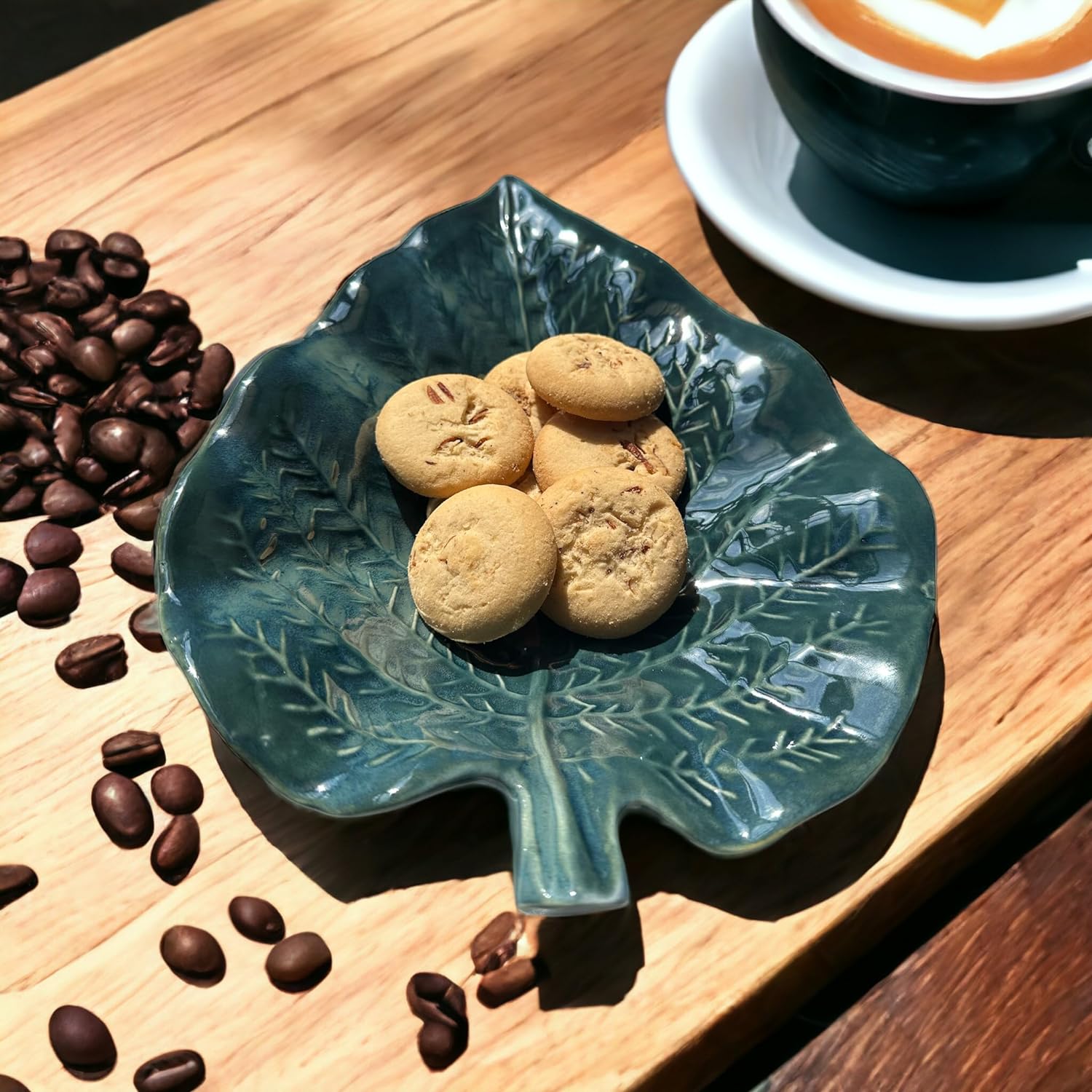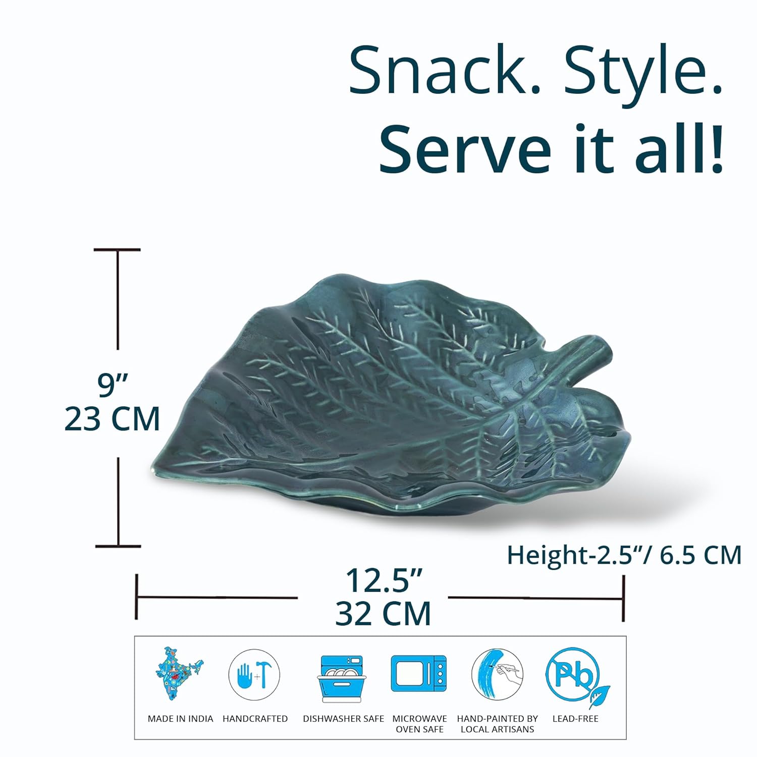 Ambert Green Ceramic Leaf Shaped Snacks Serving Tray, Microwave & Dishwasher Safe